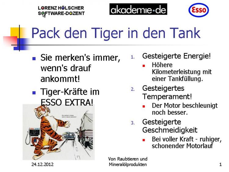 Daher möchte ich Ihnen zeigen, wie aus einer fertigen Idee eine solche Katastrophen-Präsentationsfolie erstellt werden kann mit all den üblichen Fehlern. Als Ausgangspunkt für mein kleines Gedanken-Experiment nehme ich ein Plakat von 1965 mit dem heute noch bekannten Slogan "Pack den Tiger in den Tank".