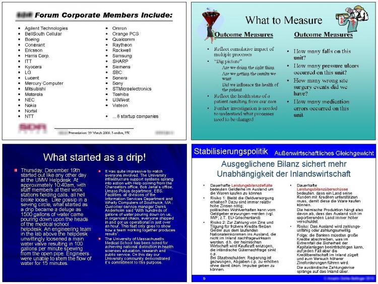 Sie denken, so schlimm ist es doch gar nicht? Ich hätte maßlos übertrieben? Dann gucken Sie sich mal eine beliebige PowerPoint-Folie an. Sie werden in jeder Präsentation ohne Probleme einen oder meistens sogar mehrere der genannten Fehler finden: