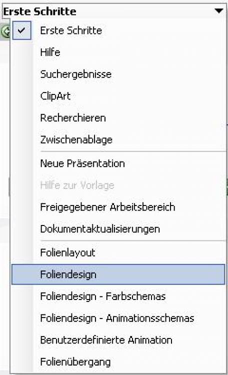 Zum Entwurf bzw. zur weiteren Bearbeitung können Sie aus dem Aufgabenbereich (Taskpane) von PowerPoint die notwendigen Werkzeuge anwenden. Der Aufgabenbereich wird eingeblendet mit "Ansicht" - "Aufgabenbereich".