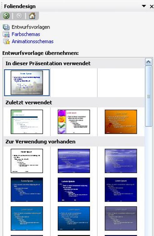 Zum Entwurf bzw. zur weiteren Bearbeitung können Sie aus dem Aufgabenbereich (Taskpane) von PowerPoint die notwendigen Werkzeuge anwenden. Der Aufgabenbereich wird eingeblendet mit "Ansicht" - "Aufgabenbereich".