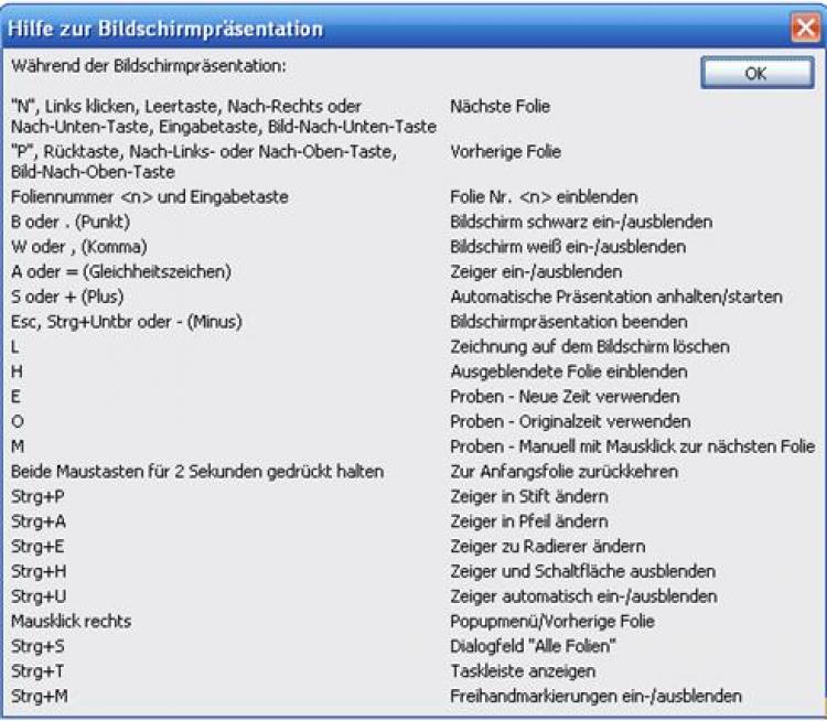 Wenn Sie <F1> während der Präsentations-Schau drücken, wird Ihnen ein Hilfefenster eingeblendet.
