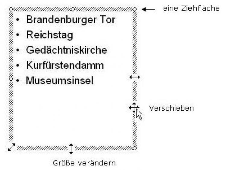 Die beiden letzten Textfelder können Sie selbst leicht verändern. Klicken Sie in ein Textfeld; das Feld wird aktiviert und der Rahmen erscheint. Zeigen Sie auf den Rand, verändert sich der Mauszeiger in ein Doppelpfeilkreuz zum Verschieben. Durch Ziehen wird das Textfeld auf der Folie verschoben. Auf einer Ziehfläche wird der Mauszeiger zu einem Doppelpfeil, der die Richtung anzeigt, in der die Größe des Textfeldes beim Ziehen verändert wird.