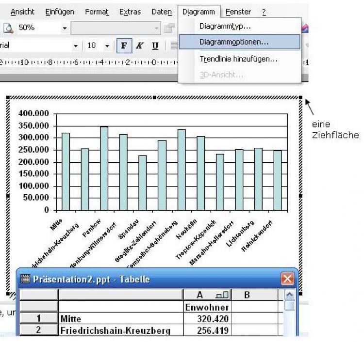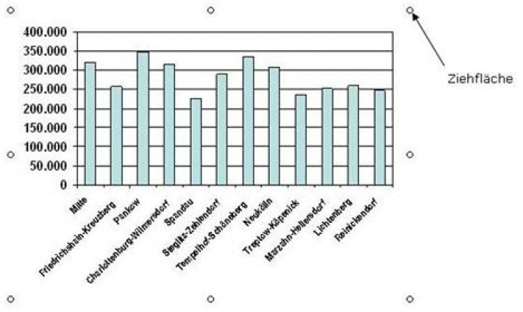 Lage und Größe des Diagramms verändern Sie genauso wie es für Tabellen im vorigen Kapitel erläutert worden ist. D.h. Sie klicken das Diagramm einmal an: