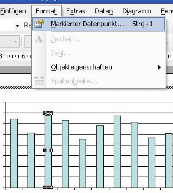 Klicken Sie in das Diagramm und drücken Sie die Cursortaste "Pfeil nach links" oder "Pfeil nach rechts". So werden Ihnen die einzelnen Objekte des Diagramms markiert, die Sie entweder über die rechte Maustaste oder das Menü, "Format", in ihrer Darstellung verändern können!