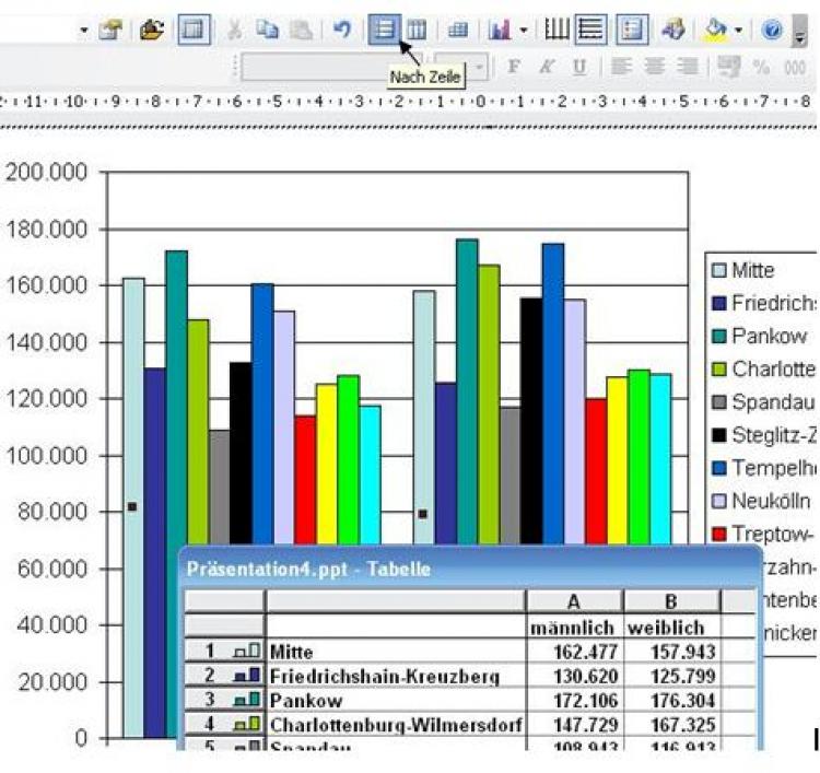 Datenpunkte des Diagramms aus den Zeilen der Tabelle. Die Legende zeigt die einzelnen Namen der Zeilen an (vgl. Präsentation5.ppt).
