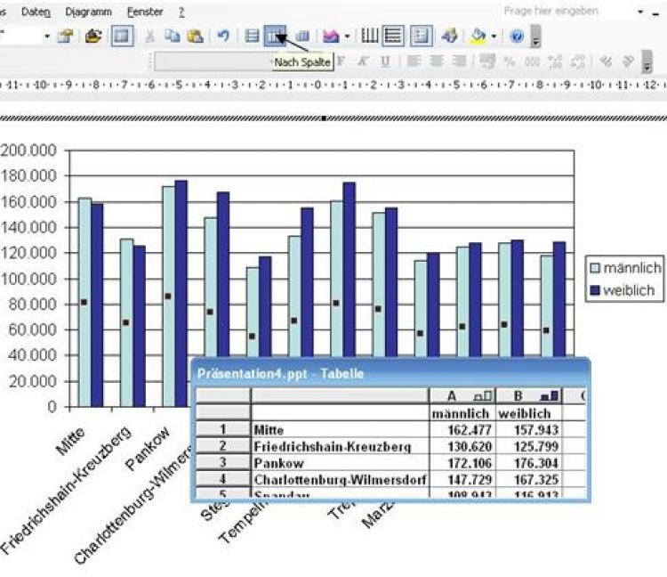 Datenpunkte des Diagramms aus den Spalten der Tabelle. Die Legende zeigt die einzelnen Namen der Spalten an. (vgl. Präsentation4.ppt)