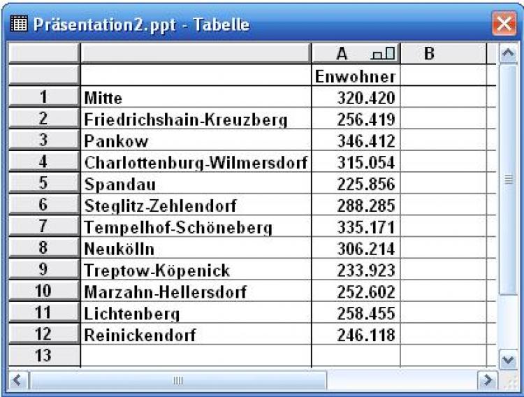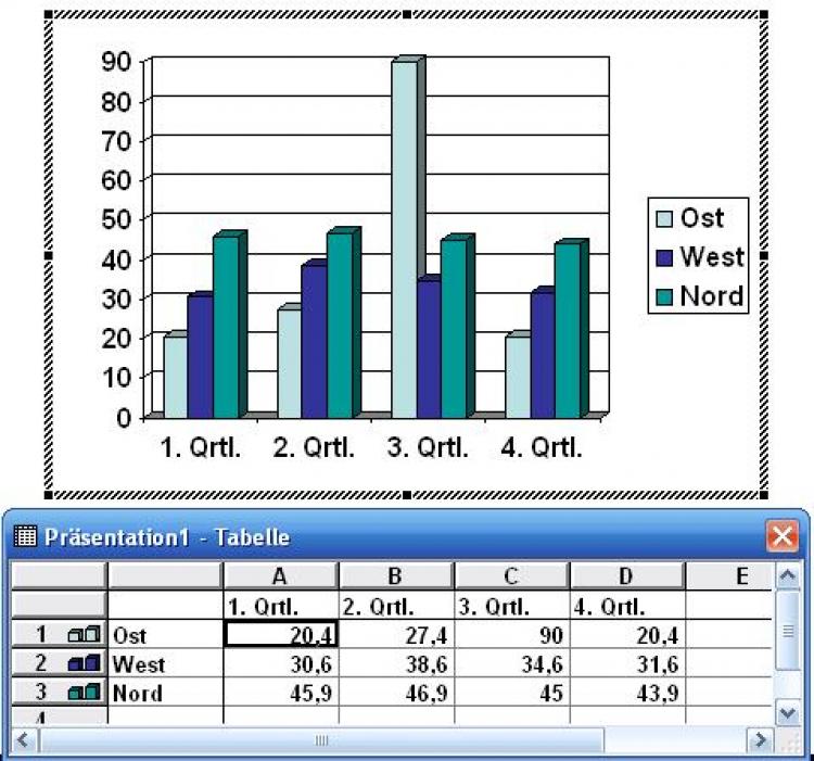 Beginnen Sie auf einer geeigneten Folie mit "Einfügen" - "Diagramm..." und geben Sie die graphisch darzustellenden Daten in die angezeigte Beispieltabelle ein.