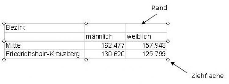 Mittels Klicken auf das Objekt markieren Sie es. Durch Ziehen am Rand (nicht an den Ziehflächen!) können Sie die Tabelle verschieben. Vermittels Ziehen an einer der acht Ziehflächen lässt sich die Größe der Tabelle bei unveränderter Anzahl der gezeigten Zeilen und Spalten variieren.