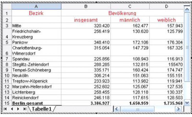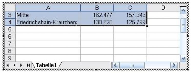 Durch Ziehen an den Ziehflächen und Rollen an den Bildlaufleisten verändern Sie den sichtbaren Ausschnitt des Tabellenblattes.