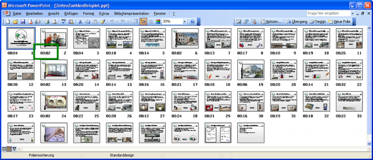 Damit lassen Sie die Präsentation ganz normal laufen und finden anschließend in der Foliensortierung links unterhalb der Folien die jeweiligen Folienzeiten: