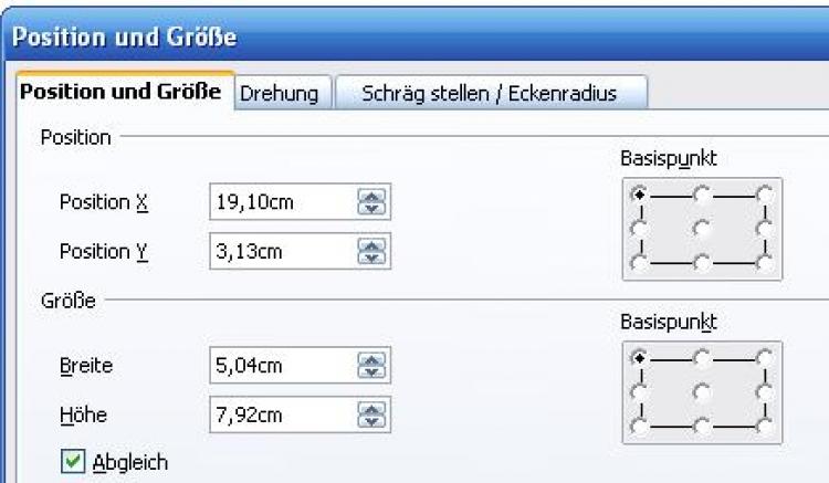 Besser ist, das Kontextmenü zu verwenden, damit vermeiden Sie Verzerrungen des Originalbildes. Über Kontextmenü (rechte Maustaste) des Befehls "Position und Größe..." können Sie die Positionskoordinaten X und Y verändern. X und Y geben immer den rechts daneben angezeigten Positionspunkt des Bildes an.