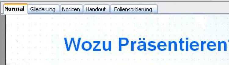 Für die Bearbeitung einer Präsentation gibt es fünf verschiedene Ansichten, in die Sie durch Klick auf die verschiedenen Registerkarten wechseln können: