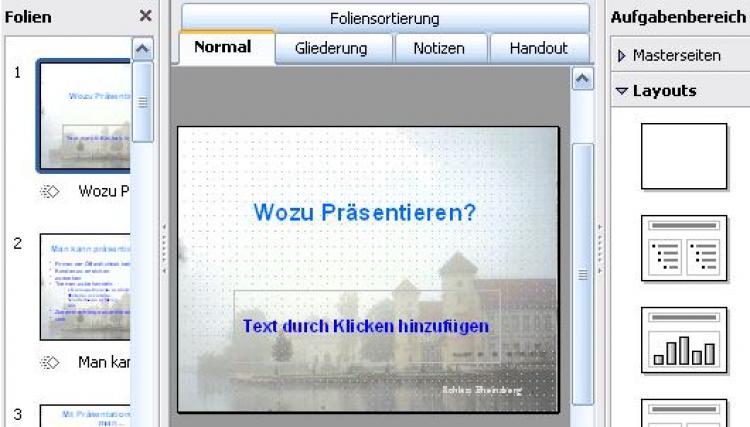 Wenn im Menü "Ansicht" der "Aufgabenbereich" aktiviert ist, wird dieser zusätzlich rechts von der Normalansicht sichtbar. Im Aufgabenbereich können Sie die Präsentation umfassend bearbeiten, dafür sind die Untermenüs für Masterseiten, Layouts, benutzerdefinierte Animationen und Folienübergänge auszuwählen; ihre Verwendung wird im Laufe des Kurses noch beschrieben.