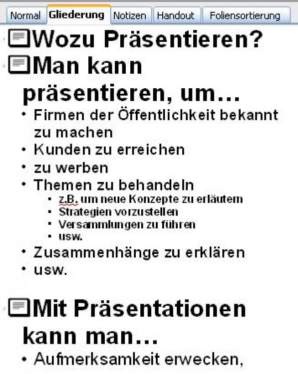 Über die Registerkarte Gliederung wird Ihnen die Gliederung der Präsentation gezeigt. Hauptgliederungspunkte sind die jeweiligen Folienüberschriften (Titel), darunter erscheinen die einzelnen Zeilen auf der Folie.