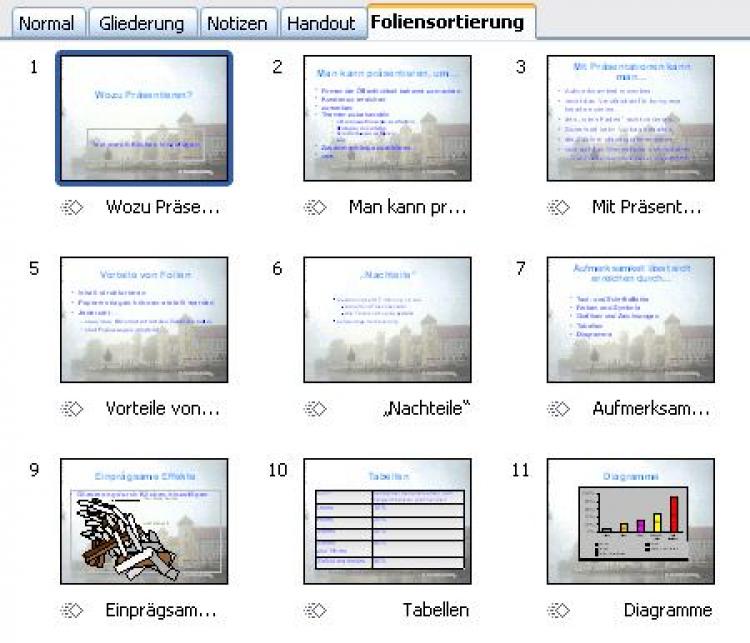 Sie haben soeben eine Präsentation bestehend aus 12 Folien gesehen. Ein Klick auf die Registerkarte Foliensortierung zeigt Ihnen in einfacher Übersicht alle Folien der Präsentation an.