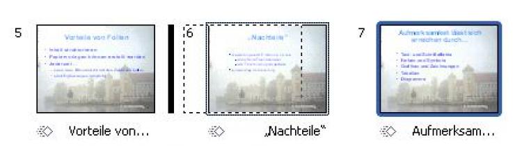 Auch in dieser Ansicht können Sie, ähnlich wie in der Gliederungsansicht, die Reihenfolge der einzelnen Folien verändern. Anklicken der gewünschten Folie und anschließendes Ziehen mit der Maus erlaubt Ihnen, die Folie zu verschieben. Das Ziel wird durch einen dicken senkrechten Strich zwischen zwei Folien gekennzeichnet. Lassen Sie die Maustaste los, wird die Folie an diese Stelle eingefügt.