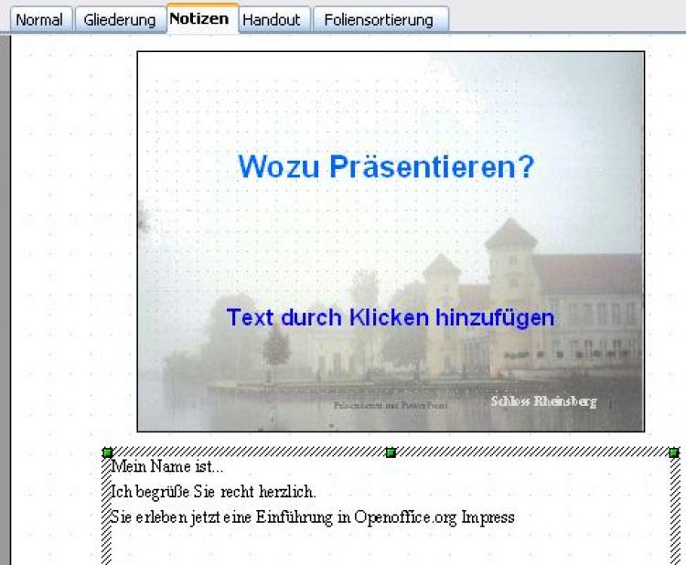 Ihre eigenen Bemerkungen oder gar das gesamte Redemanuskript können Sie im Notizbereich für jede Folie vermerken. Dieser Bereich ist dem Zuhörer während der Präsentation nicht sichtbar. Aus diesen Informationen können Sie sich für Ihren Vortrag ein Redemanuskript erstellen und ausdrucken. Mausklick auf die Registerkarte Notizen zeigt das Fenster vom Notizbereich.