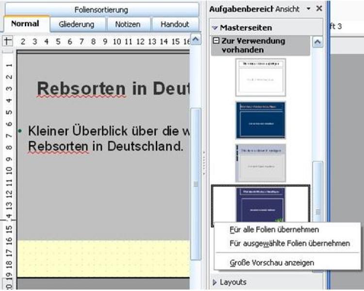 Das gesamte Erscheinungsbild der Präsentation wird durch das Design einer Masterseite bestimmt, die Sie im Aufgabenbereich auswählen können.