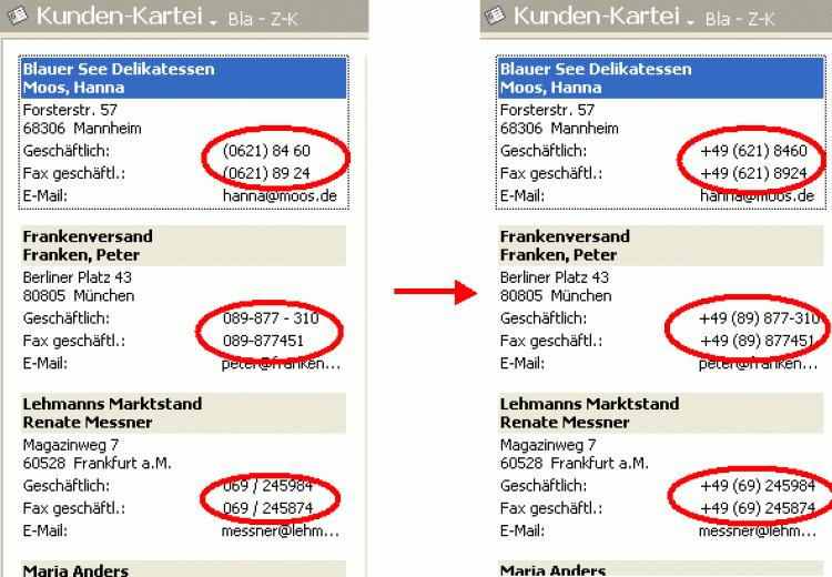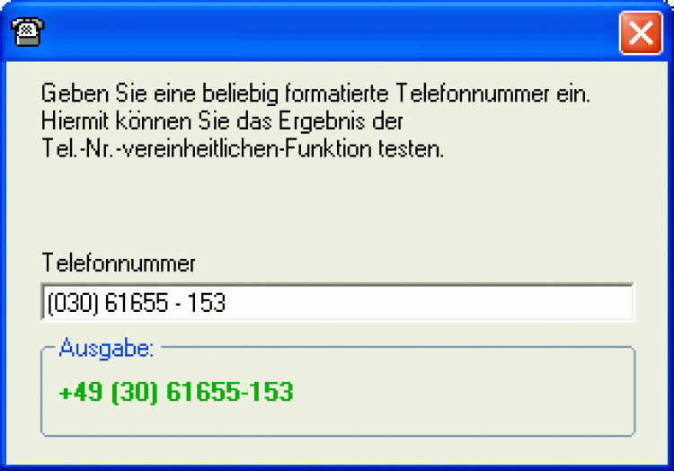 Die Arbeitsweise dieser Funktion können Sie bei Bedarf über den Menüpunkt "Extras" - "Telefonnummer testen" ausprobieren: Hier geben Sie die von Ihnen benutzten Rufnummerformate ein (zum Beispiel mit Klammern, Schräg- und Bindestrichen) und sehen sofort die "Übersetzung" in die allgemeinverständliche internationale Notation: