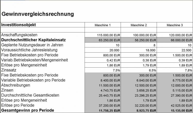 Für die Anschaffung einer Produktionsanlage soll eine Gewinnvergleichsrechnung durchgeführt werden. Es werden die gleichen Posten wie in der Kostenvergleichsrechnung verwendet - allerdings kommt hier noch der Erlös hinzu, den die produzierten Güter einbringen werden.