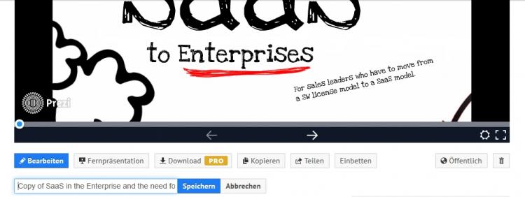 Um den Titel der Prezi zu ändern, wählen Sie „Prezi anzeigen“. Unterhalb des Präsentationsfensters können Sie die Prezi „Bearbeiten“, „Kopieren“ und „Teilen“. Darunter steht der Titel der Prezi: "Copy of … ".