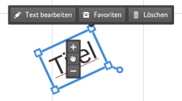 Um den Text zu bearbeiten, zu verschieben oder in der Größe anzupassen, klicken Sie auf das Textobjekt. Es erscheint ein blauer Rahmen um den Text. Über „Text bearbeiten“ können Sie den Text verändern. Mit dem Hand-Symbol verschieben Sie das Textobjekt an eine andere Stelle und über einen der vier Anfasser an den Rahmenecken vergrößern oder verkleinern Sie den Text. Wenn Sie mit der Maus über eine der Ecken fahren, erscheint zusätzlich ein kleiner Ring. Über diesen Ring können Sie das Textobjekt drehen.