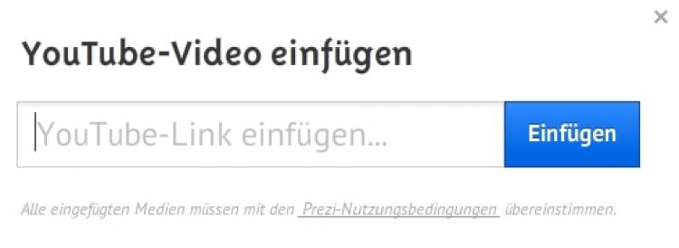 Um ein Video in Ihre Prezi einzufügen, öffnen Sie in einem neuen Tab das entsprechende Video auf youtube.com. Unterhalb des Video-Players klicken Sie auf „Teilen“ und kopieren die Kurz-URL in die Zwischenablage (Strg + C). Wechseln Sie zurück zu Ihrer Prezi und fügen Sie die Kurz-URL mit Strg + V über das Menü Einfügen > YouTube-Video ein.
