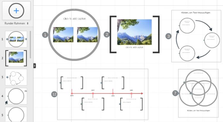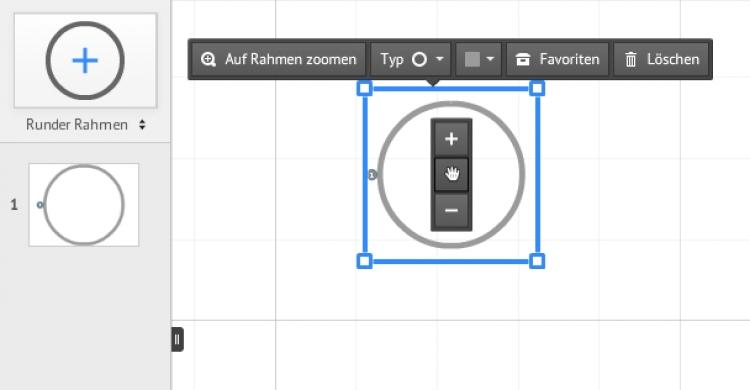 Für visuelle Effekte können Sie einen Rahmen mitsamt seinem Inhalt drehen. Im Präsentationsmodus wird aus dem Übergang vom vorherigen Rahmen zu dem gedrehten Rahmen eine Kamerafahrt. Wenn Sie Details verkleinern und in einen Rahmen setzen, können Sie in die Arbeitsfläche hineinzoomen.