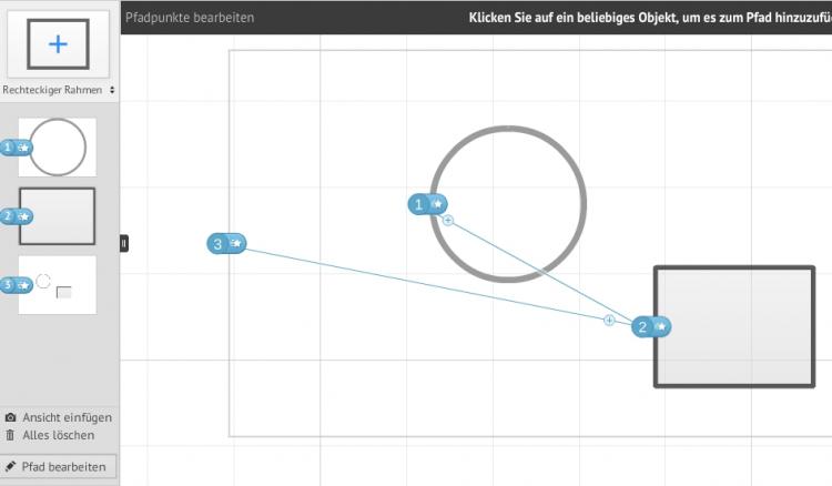 Sobald Sie aus der oberen linken Ecke einen Rahmen auf Ihre Arbeitsfläche ziehen, wird ein Pfad angelegt. Die einzelnen Pfade sehen Sie in der linken Leiste.
