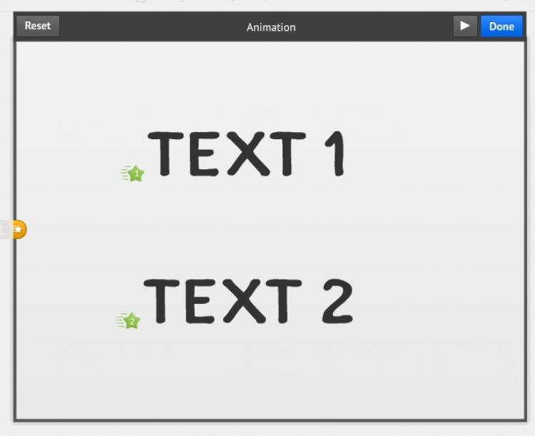 In diesem Beispiel ist der rechteckige Rahmen im Präsentationsmodus zunächst leer, im nächsten Schritt erscheint TEXT 1 und danach TEXT 2. Sie können eine Vorschau durch einen Klick auf den Abspielpfeil ansehen. Mit „Reset“ können Sie alle Animationsschritte wieder löschen und von vorne beginnen. Mit einem Klick auf „Done“ beenden Sie die Animationseinstellungen. Beenden Sie anschließend den Pfad-Bearbeitungsmodus mit einem Klick auf „Fertig“ und wechseln Sie dann in den Präsentationsmodus.