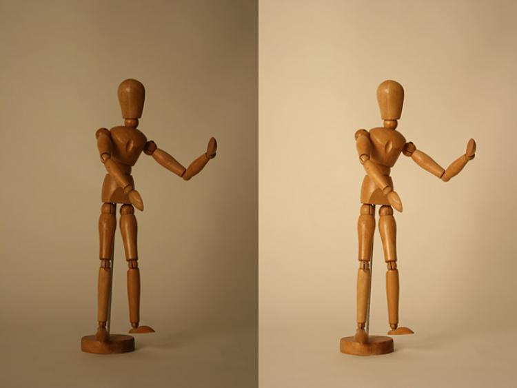 Die Brennweite, mit der fotografiert wird, hat ebenfalls einen großen Einfluss auf die Ausdehnung der Schärfentiefezone. In unserer einfachen Form der Produktfotografie kann man grundsätzlich mit allen Brennweiten arbeiten, man muss aber wissen, dass eine Weitwinkel-Optik das Motiv anders abbildet als ein Normal- oder Teleobjektiv. In der praktischen Arbeit greift man oft auf die Weitwinkel-Einstellung zurück, z. B. um das Objekt vollständig auf das Bild zu bekommen. Man erzielt auf diese Weise auch die größtmögliche Schärfentiefe. Aber gerade das Weitwinkel verzerrt das Motiv am stärksten. Wägen Sie also ab, ob Sie diese Verzerrung in Kauf nehmen wollen und können. Günstiger wäre es, mit einer Normal- oder leichten Tele-Optik zu arbeiten (50-80 mm), damit das Objekt so naturgetreu wie möglich abgebildet werden kann. Dazu müssen Sie aus einer größeren Entfernung arbeiten; das wiederum bewirkt, dass Sie mehr Platz und möglicherweise auch einen größeren Hintergrundkarton benötigen.
