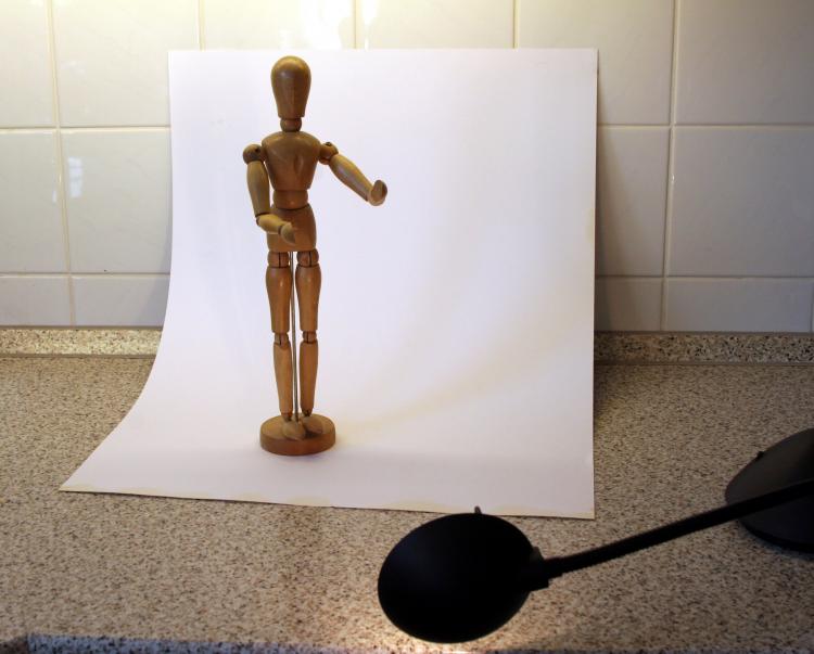 • Befestigen Sie das Papier mit Tesafilm oder Knetgummi an der Wand, sodass sich eine Hohlkehle bildet. Stellen Sie den Gegenstand so weit wie möglich nach vorne, also weit weg vom Hintergrund. Beleuchten Sie Ihren Gegenstand mit einer oder mehreren Lampen so, dass möglichst wenig störende Schatten entstehen.