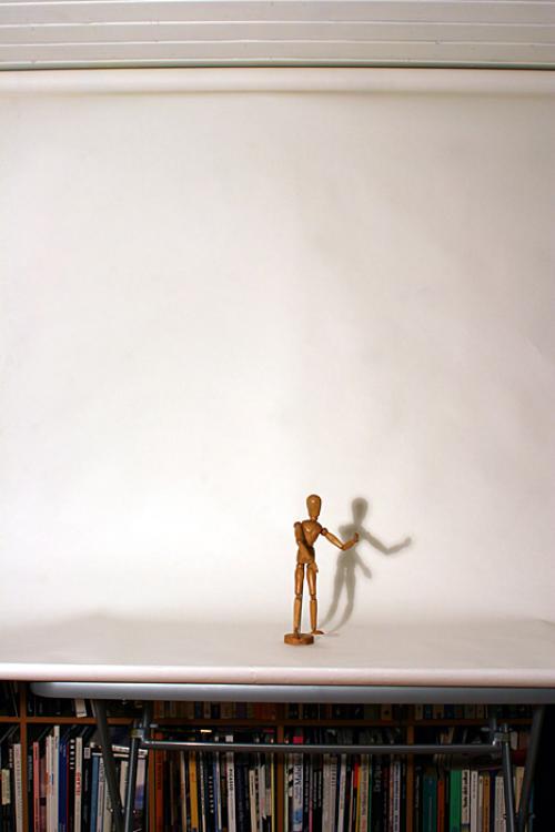Das Licht kam hier von einer einfachen Fotoleuchte (250 Watt), die das Motiv von der linken Seite aus etwa 1,5 Metern Abstand zum Motiv in einem Winkel von 45° beleuchtete. Ich hätte aber auch einen Halogen-Strahler oder Baustrahler dort aufstellen können. Man sieht allerdings einen Schlagschatten, den die Figur auf den Hintergrund wirft: Das ist das Ergebnis von hartem, gerichtetem Licht. Wenn man das Licht gegen die Zimmerdecke richtet oder einen Diffusor verwendet, verschwindet der Schatten. Dann wird auch das Glänzen der lackierten Figur geringer.