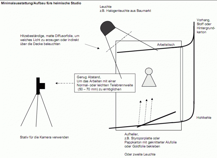 Wichtig ist, dass die Arbeitsfläche an eine Wand grenzt, an der Sie den Hintergrundkarton befestigen können. Der Hintergrundkarton soll eine Hohlkehle bilden, also am Übergang von der horizontalen Tischoberfläche zur vertikalen Wand in einem weichen, runden Bogen nach oben verlaufen (siehe unten).