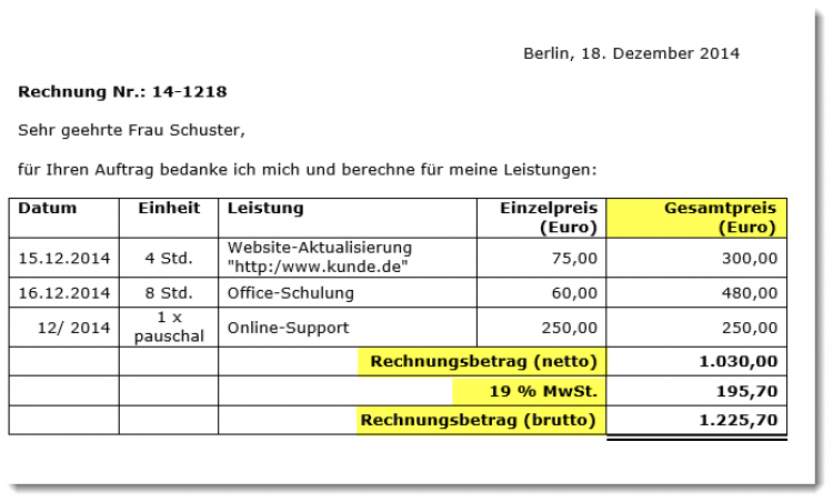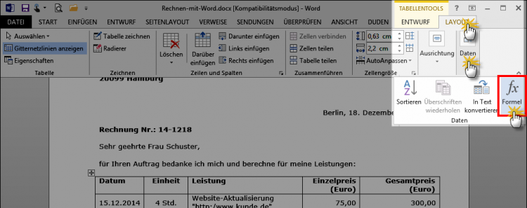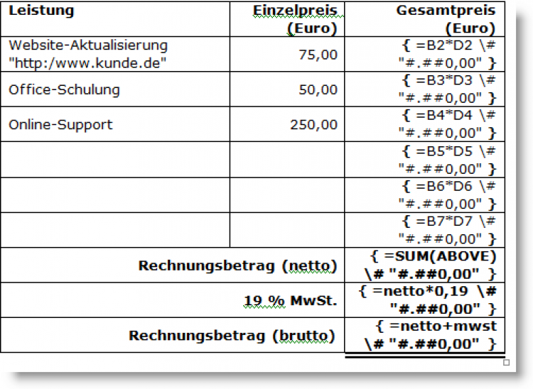 Zum Beispiel: eine Ausgangsrechnung in Word, die sich selbst ausrechnet