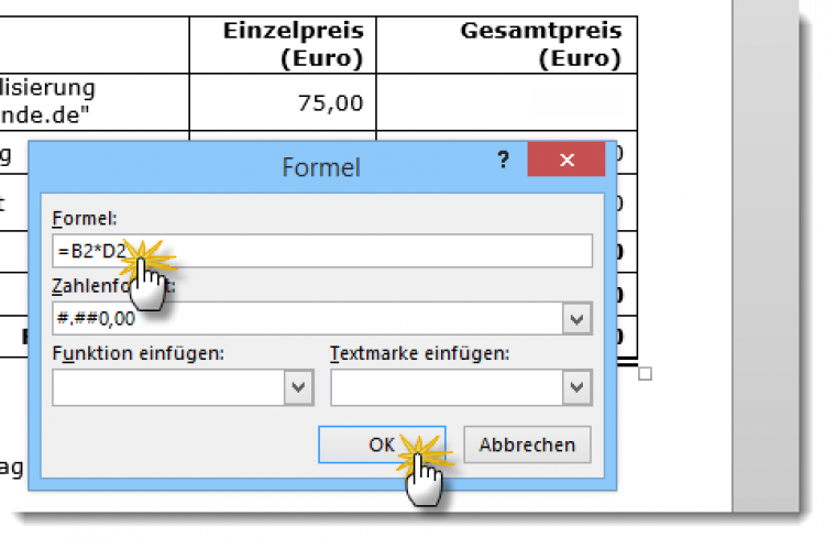 Sie stellen den Cursor in die zu berechnende Tabellen-Zelle,