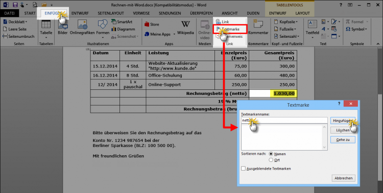 Textmarken als Rechnungs-Variablen: So können Sie die Werte auch später ändern, ohne das dadurch alles falsch wird.