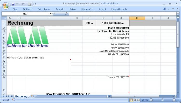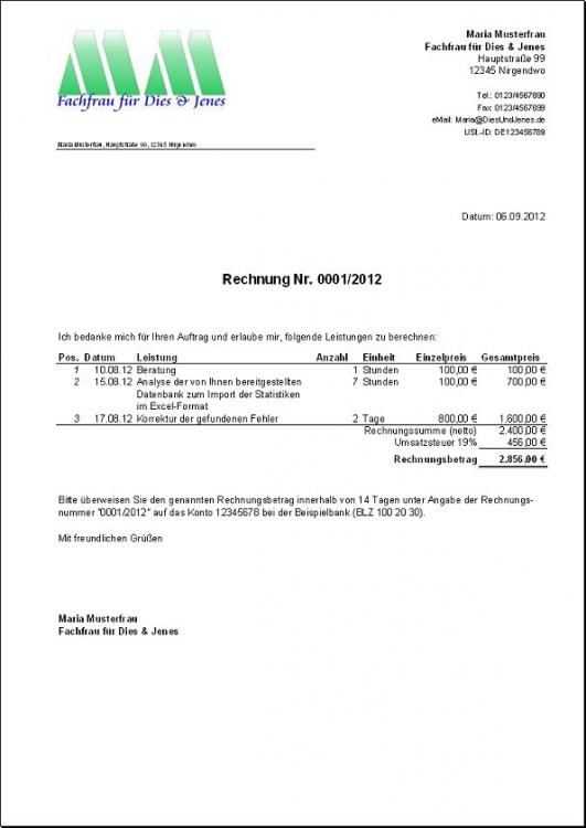 Rechnungen haben ein recht standardisiertes Aussehen, so dass eine einheitliche Vorlage sehr hilfreich ist. Für ein Beispielunternehmen "Maria Musterfrau - Fachfrau für Dies & Jenes" sieht eine fertige Rechnung etwa so aus: