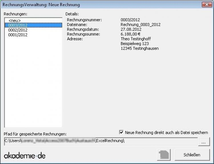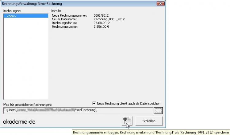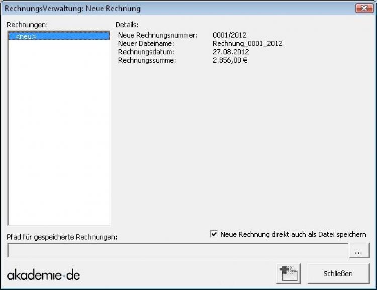 Die Datei erhält beim Speichern einen automatischen Dateinamen, im obigen Beispiel also "Rechnung_0001_2012" mit der passenden Datei-Endung.