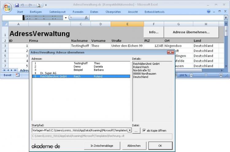 Adresse: derzeit die verbundene Zelle $A$12, dies ist das Eingabefeld für die Adresse. Sie können hier die AdressVerwaltung von akademie.de nutzen.