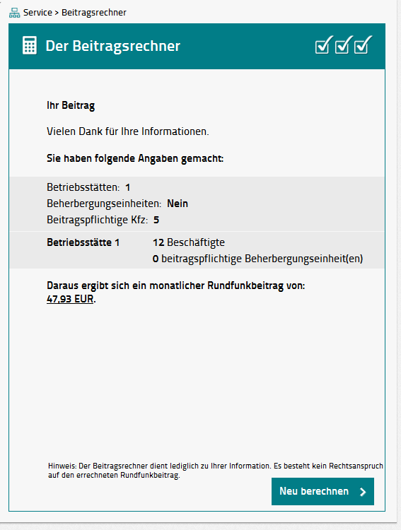 Mithilfe des Beitragsrechners der öffentlich-rechtlichen Sendeanstalten können Sie die künftige Beitragsbelastung Ihres Betriebes mit wenigen Mausklicks ermitteln: