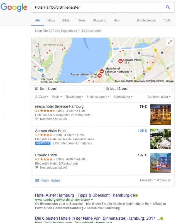 So sehen die Google-Ergebnisse bei einer Hotelsuche aus. Oben einige wenige prominent dargestellte Treffer. Darunter die anderen Ergebnisse; die ersten beiden Einträge dieser klassischen Liste sind jedoch keine Hotels, sondern Verzeichnisse.