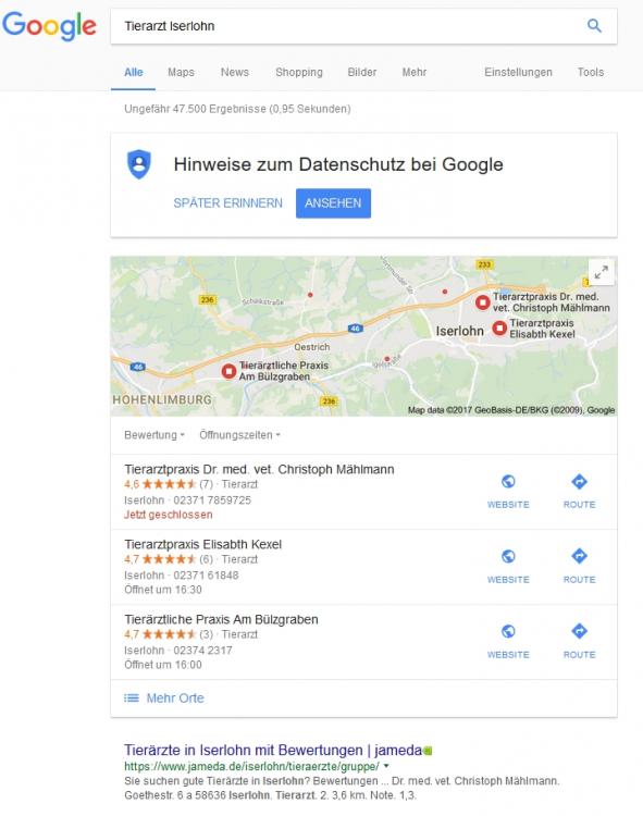 Ein Beispiel: Sucht man einen Tierarzt in ganz Iserlohn, bekommt man drei lokale Ergebnisse. Hier werden die hervorgegebenen Treffer mit Links zum Routenplaner und zur Website aufgeführt statt wie bei Hotels mit Preisen. Danach kommt wieder als oberster Treffer in der klassischen Ergebnisliste ein Branchenverzeichnis. Erst nach der örtlichen Eingrenzung werden andere Tierärzte und deren Websites sichtbar.