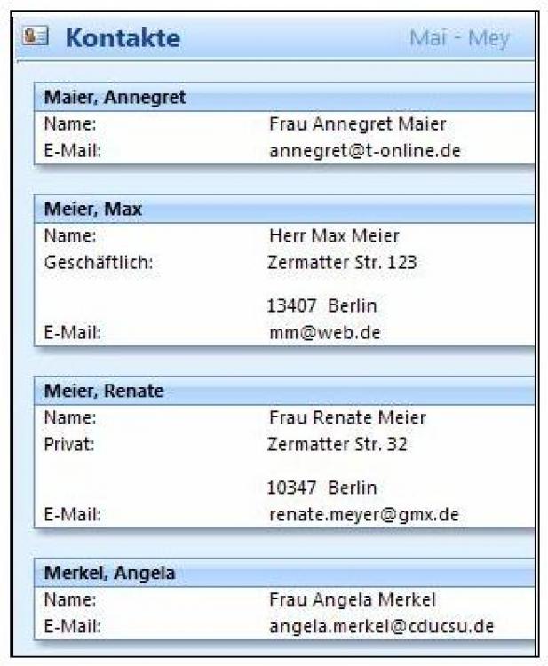 Ausschnitt aus Kontakten. WICHTIG: Die E-Mail-Adressen