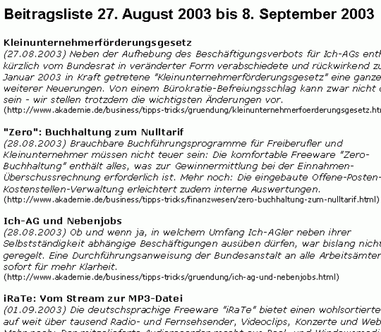 Am Beispiel eines kleinen Auszugs aus einer Datenbank mit Informationen über akademie.de-Beiträge wollen wir Ihnen zeigen, wie eine solche Liste zustande kommt. Ausgangspunkt ist folgende Tabelle mit 4 Feldern, denen Informationen