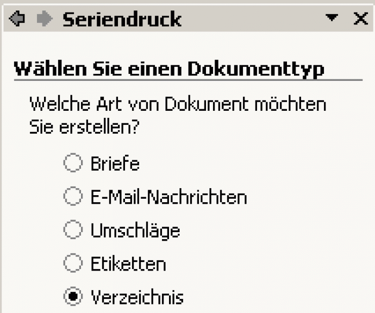 Das Beste: Sie müssen nichts neues lernen: Denn die Listenerstellung unterscheidet sich praktisch überhaupt nicht von der Serienbriefproduktion. In einem Verzeichnis-Dokument fehlt schlicht der Seitenumbruch nach den einzelnen Datensätzen. Im Schritt 1 des Seriendruck-Assistenten (oder nachträglich über den Button 1 der Seriendruck-Symbolleiste) wählen Sie den Dokumenttyp "Verzeichnis"