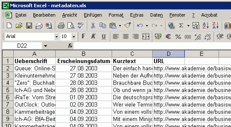 Am Beispiel eines kleinen Auszugs aus einer Datenbank mit Informationen über akademie.de-Beiträge wollen wir Ihnen zeigen, wie eine solche Liste zustande kommt. Ausgangspunkt ist folgende Tabelle mit 4 Feldern, denen Informationen