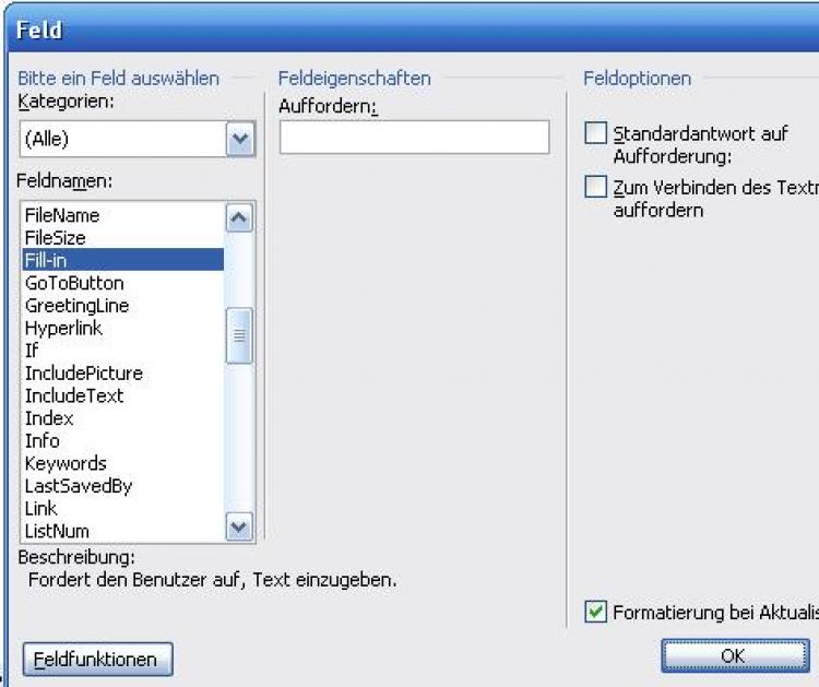 Wenn Sie das Feld Fill-in ausgewählt und mit OK quittiert haben, erscheint diese Dialogbox.
