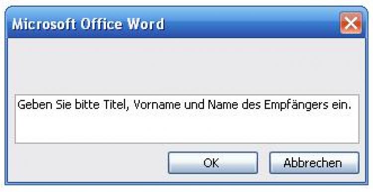 Die spätere Bedienaufforderung z.B. "Geben Sie bitte Titel, Vorname und Name des Empfängers ein." geben Sie als Text in die Dialogbox beim Einfügen des Feldes ein. Er dient später beim Aufruf im neuen Dokument als Aufforderung, diese angeforderten Angaben für den Empfänger einzutippen, die dann an der vorbereiteten Stelle im neuen Dokument automatisch eingetragen werden.