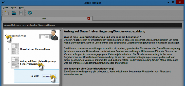 rufen im Bereich "Unternehmer" das Programm-Modul "Antrag auf Dauerfristverlängerung/Sondervorauszahlung" auf,